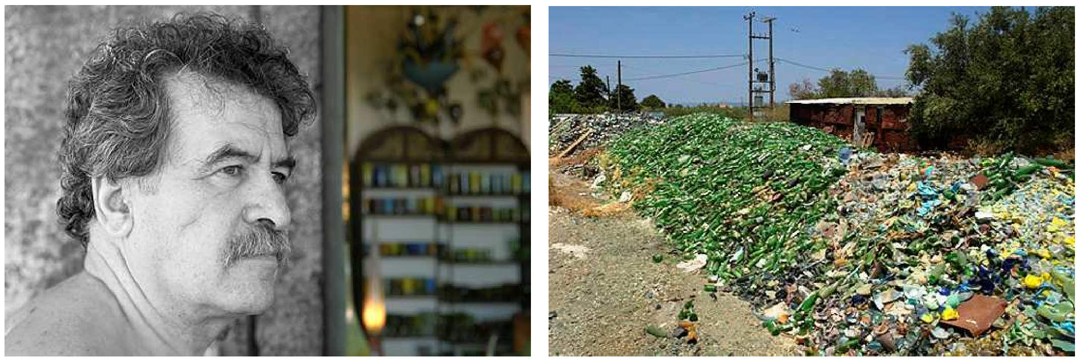 In 1986 when most Greeks have been at loose ends with the word recycling, Andreas Tzompanakis (see fig. left) opened his factory in his native village Kokkino Chorio and began to establish the first works of art from glass he collected (see fig. right). Many years have been passed since. The kiln from the early days is now decorative integrated in the shop, and been replaced by a larger, more modern oven.