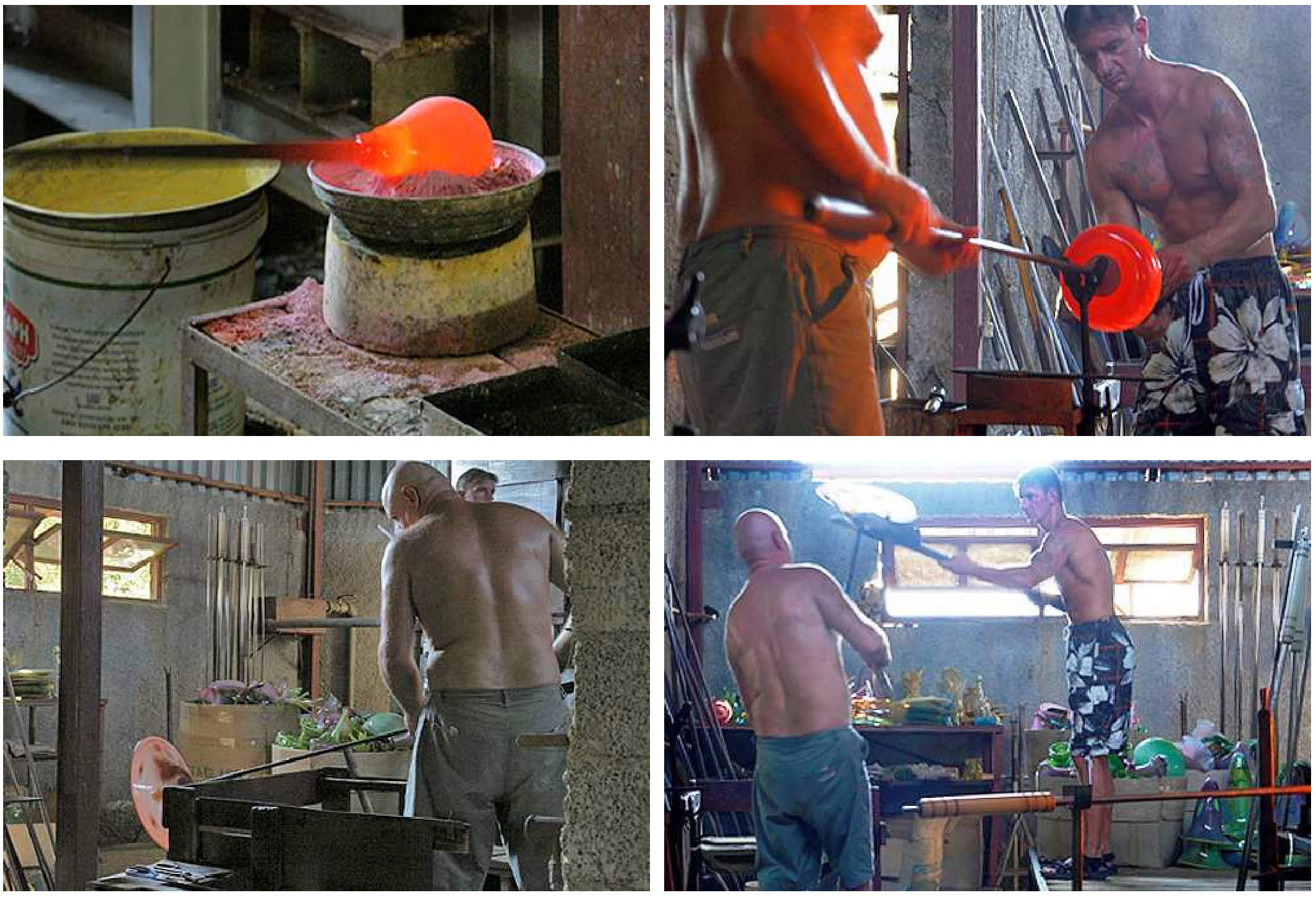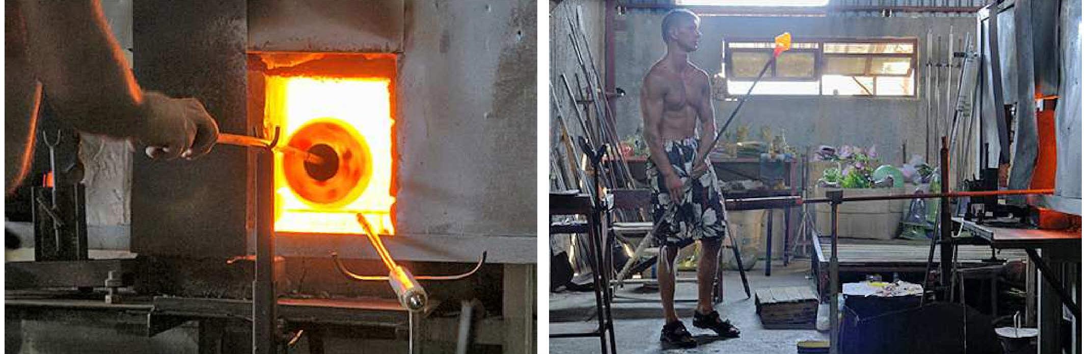 Every day (except Monday) the glassblowers can be seen at their work between of 8 am and 3 pm. The glass is first melted at the top of the glass making pipe at a temperature 1400-1500 degrees Celsius and then brought in form at 1200 degrees Celsius. There is much experience needed to see the right temperature of the glass and then to handle it correctly.